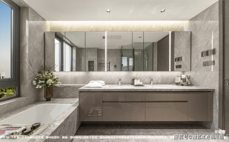 更棒的是,主卧有双台盆、厨房隔壁还设置了家政间,可以放置洗衣机、烘干机。充满了城市平层大宅的风范。