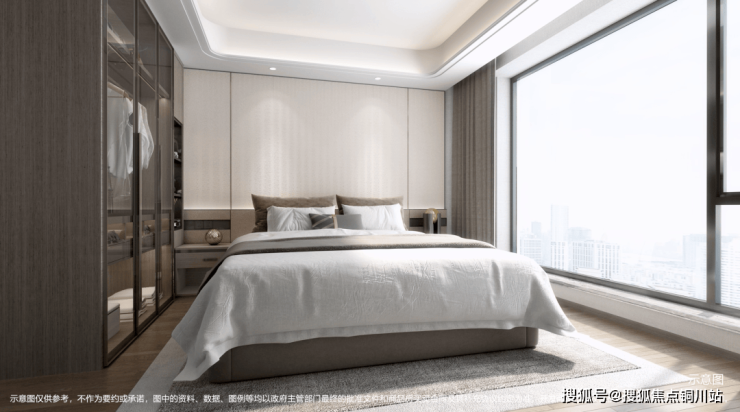 在保证客厅的尺度同时,南向主卧套房和南向客房的开间分别有约3.5米和约3.2米,比市场上很多同类产品都要舒适。主卧可以放下2米大床和衣橱。南向客房也有两个衣橱,如果作为儿童房,孩子的衣服、书籍、玩具通通可以放置进去。