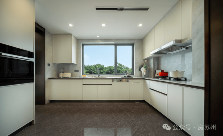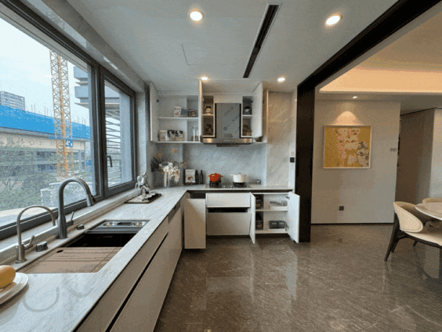 无论户型大小,做到每个户型配置都一样,价值20万的美诺六件套(燃气灶、油烟机、蒸烤一体机、洗碗机、单冷藏、单冷冻冰箱),加上厨房空调、全屋地暖、三玻两腔Low-E玻璃等配置,精装标准直接对标1500万+豪宅。