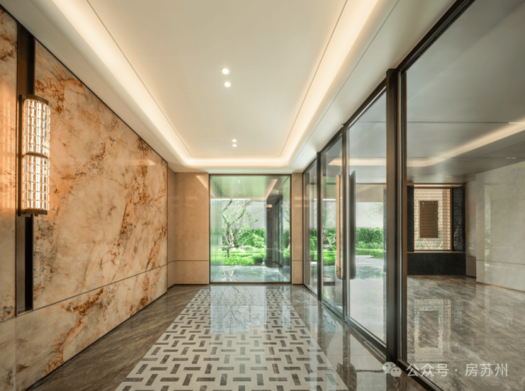地下地上双大堂全部高品质精装,深浅相间的瓷砖铺设,精美的百合拼花与金玉满堂岩板背景墙交相辉映,精致又雅奢。