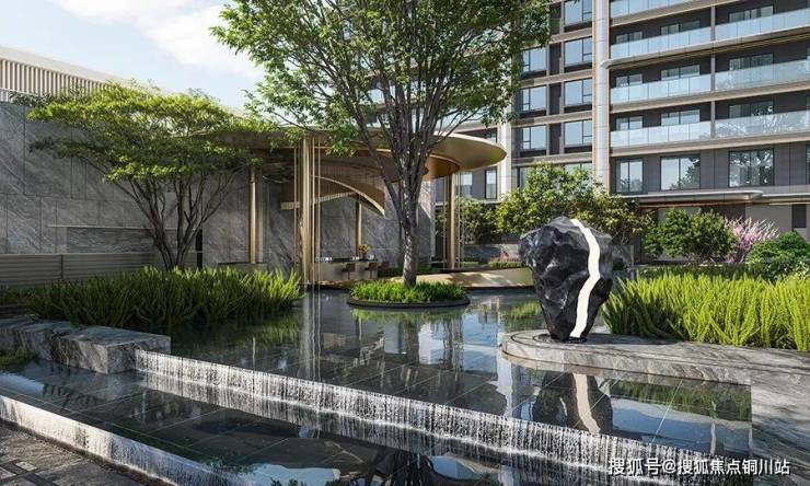 项目酒店式大门高约7.8米,长约30米,正对中庭轻奢水院景区,营造至臻归家氛围。