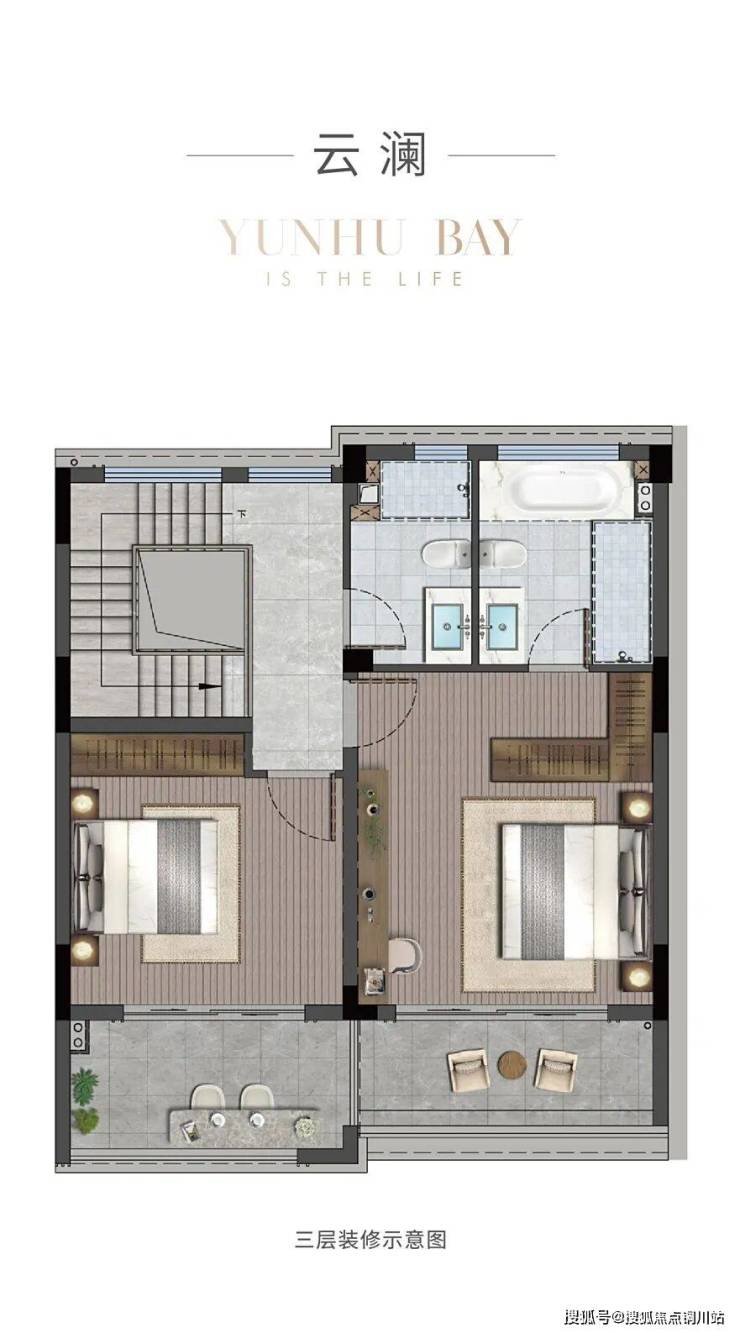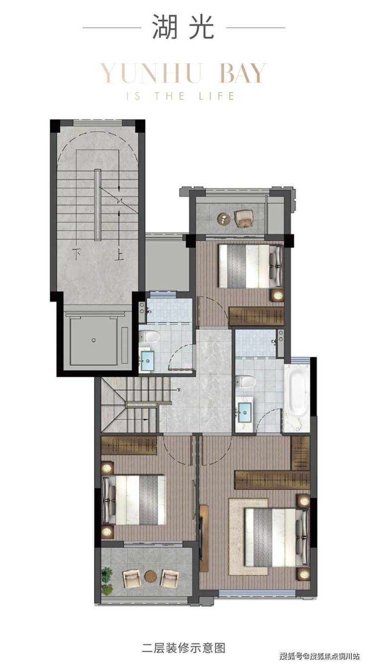 如果选建筑面积约149㎡的上叠,三层“排屋”上楼,四房两厅四卫,将墅居的私密感和舒适度稳稳安排。