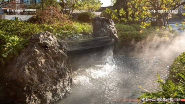 这里有着大面积的中央水景,有浮桥、置石、圆盘跌水点缀其间,仅仅是天然原石就有20块,打捞、运输、人工打磨的成本,可想而知。