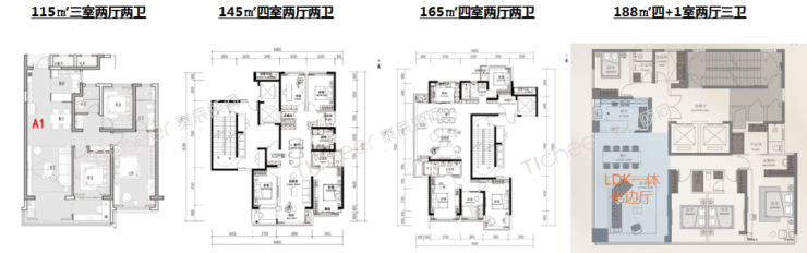 115/145㎡户型:三开间朝南,南侧联通式阳台,布局合理。188㎡为创新明星户型:2T1户布局,户型方正,无浪费面积,综合得房率达到90%,客厅+三卧室朝南,厨房+餐厅+客厅一体化布局,270度环幕视野客厅+落地窗,北侧家政间,可做储藏,也可改造为卧室。