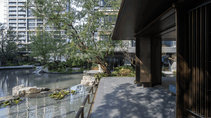 园林设计:采用 “一轴、一心、三庭” 的园林空间格局,勾勒出 “曲水流觞” 的大美意境,通过假山石、水景、长廊和曲径等元素,营造出浓郁的江南氛围。