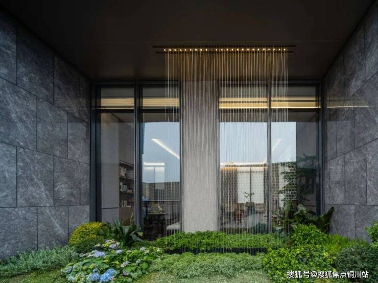 黑色的金属屋檐、金色的画框线条、爱马仕灰石材、镂空的景墙组成了大堂的主体。而地面部分,中央是涌泉水景、两侧是模拟水流动效果的绿色液态石,此外,还有能建天誉府定制的logo地砖。