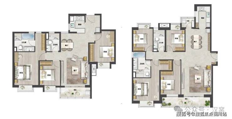 160-180㎡四居室:针对改善客户的大户型产品,配有全屋飘窗和南北双阳台,南面阳台长度达7.3米,为居者提供了宽敞的活动空间和绝佳的观景视野。