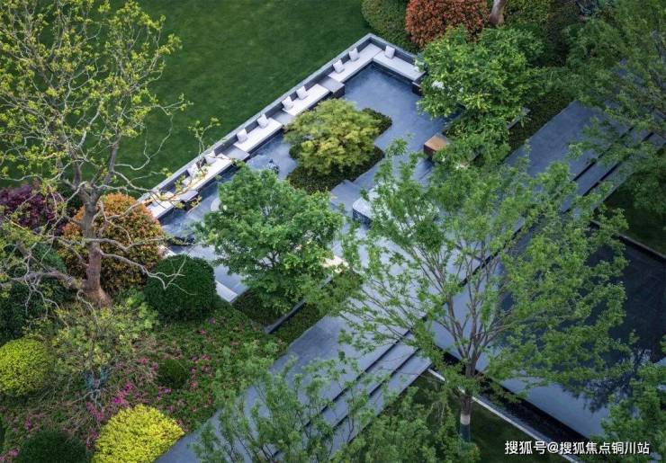 中央聚场结合美国建筑大师路易斯康落日广场的设计语言,四水归堂,水流静邃,8棵榉树矩阵,以中西式结合的设计手法,既显大气,更显格调。