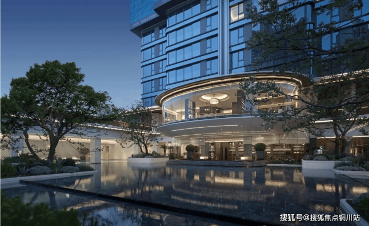 高层入户门头以26米宽曲线铝板与全景玻璃构筑,形成“会堂级”入口空间。外立面采用270°上帝弧线窗与幕墙系统,兼具典雅造型与高空间效率。