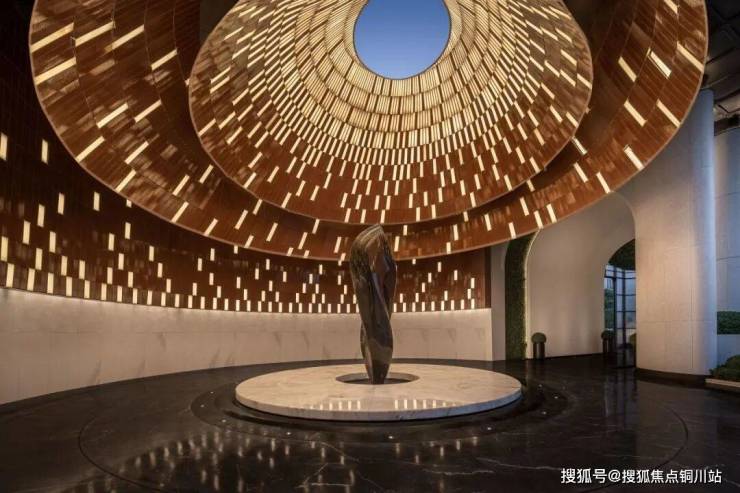 大门以贝金米黄石材与不锈钢材质打造,宽约57米,挑高10.8米,呈现剧院级的宏伟尺度。人行道设计灵感源自归元寺吉祥钟形态,通过360°环绕式布局与精巧的光影处理,营造尊贵气派的归家仪序。