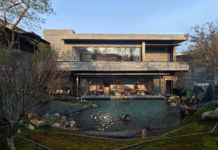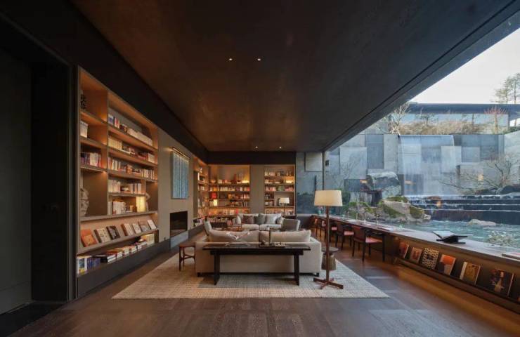 图书馆里的一整面超大幅玻璃窗,没有任何接缝,因为它是一块约14米×3.5米的双层超白玻,像雨后的空气一般透明。当你坐在这面窗前,你的视线刚好与水面齐平,把窗外的瀑布、身覆青苔的巨石、年逾150岁的鸡爪槭、悬浮在庭院之上的茶亭,全部都收入眼中。
