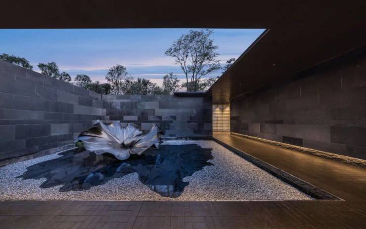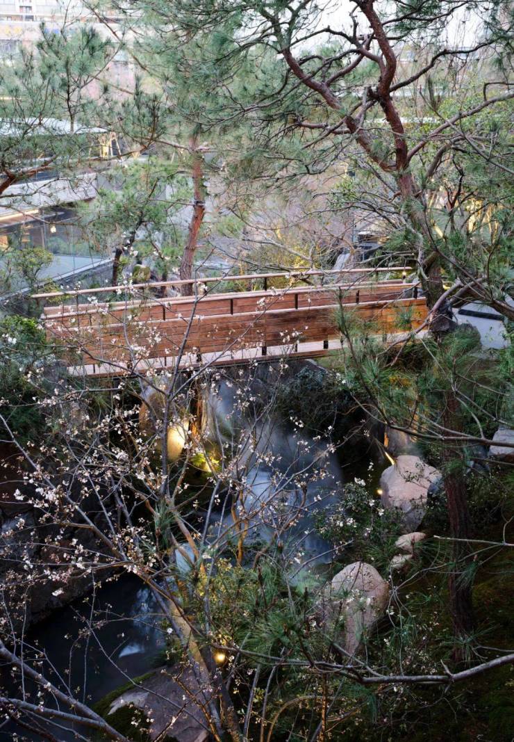 哪怕是地下泛会所的寻常走廊,也要开一扇窗,把下沉式庭院的风景借进来。当阳光把水波折射在山石上,青苔就变成了王维诗中「返景入深林,复照青苔上」的那片青苔。