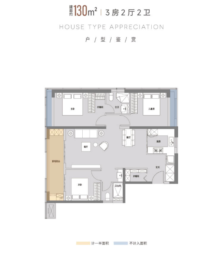 建面约130㎡户型(三房两厅两卫)