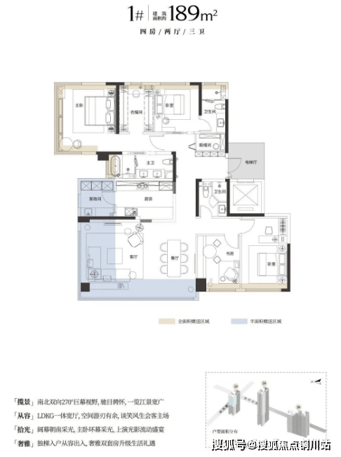 首先来看1号楼西侧对着长江的建面约189平看江大户型: