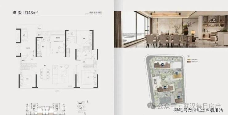 - 绛采143㎡位于单元拼接处,采用四开间朝南大横厅设计,但北向厨房与次卧采光面相对局促。