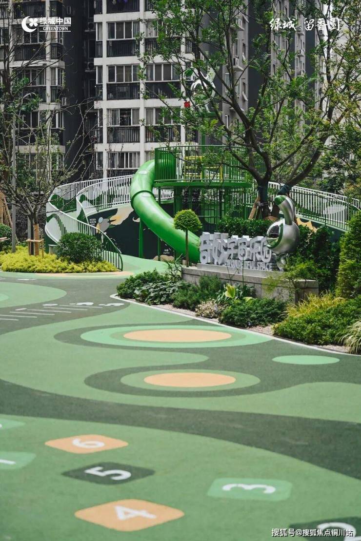 星空主题儿童乐园,把“宇宙星空”搬到业主楼下。沙池里不是传统的海沙,而是白色石英石打磨而成的白沙,不伤皮肤,没有粉尘;沙坑圆角、20毫米厚的EPDM透水地垫,孩子们玩耍更安全。
