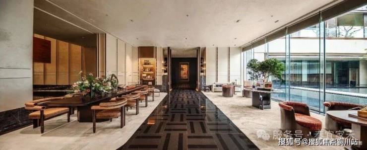 约 90 米殿堂级礼序门庭,以非遗金箔光影镌刻东方底蕴,搭配定制爱马仕灰奢石与米黄大理石,尽显地标人居的恢弘气度。下沉式水幕潺潺流淌,氤氲松弛质感;珐琅、刺绣等金陵非遗元素点缀空间,让每一处场景都成为可阅读的艺术藏品。
