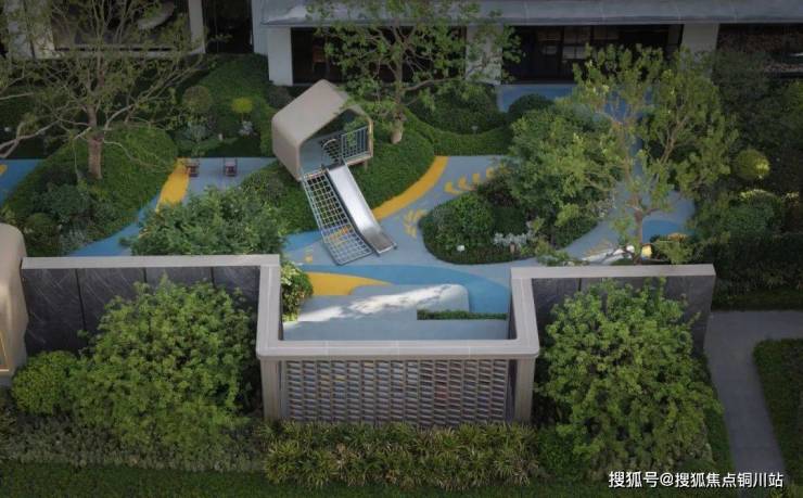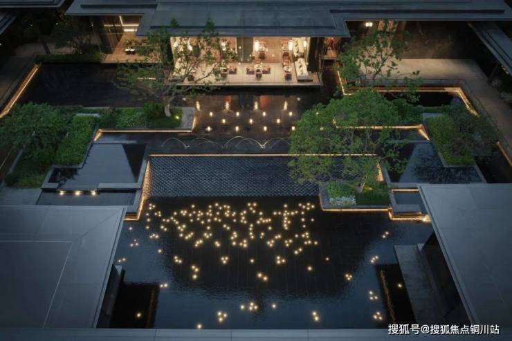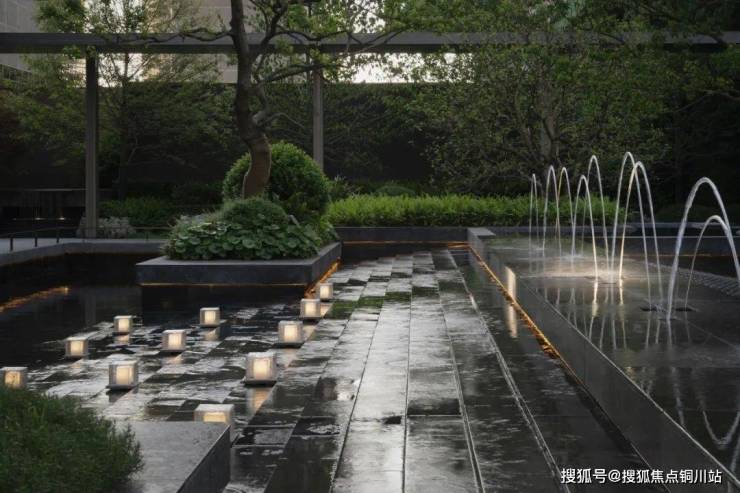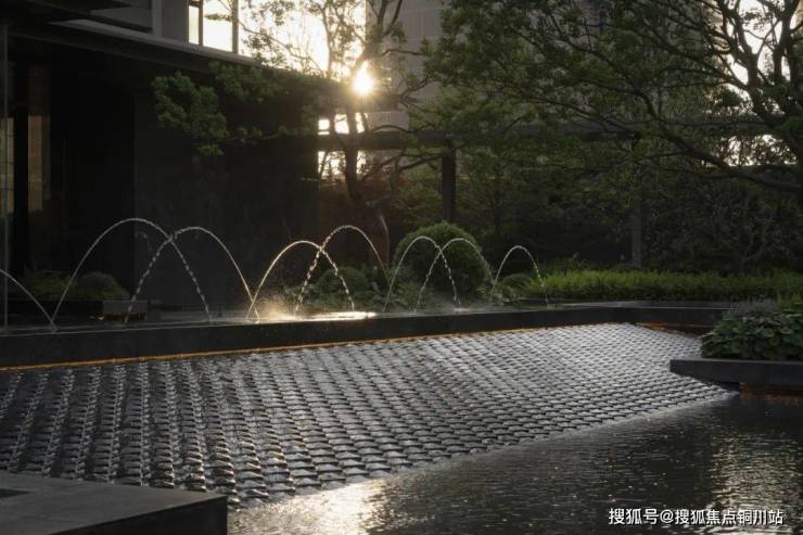水体包裹菱形面,晶莹斑驳,似水柔和如绢布滑落,双影跳泉在高低层级不同的绿化环境内灵动跳跃,形成合院视线焦点,将绿意与水的灵性在温和中饱含力量。