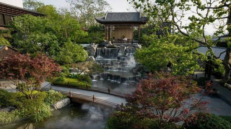 楼盘别墅区和洋房区是隔开的,别墅区打造有独立入园门户,中式飞檐翘角,搭配古铜色金属镂空大门,庄严中不失现代典雅风范,高端大气。跨过大门后,就是贯穿南北的中轴景观,一路归家,一路是品质、生活、美学的产品力展示。景观中轴上,涵盖曲水游廊、叠瀑石景、御水步桥、远山石径、云山亭等,已全部实景兑现。在这里慢行、赏景、观瀑、休憩……一步一景,步步不同景。