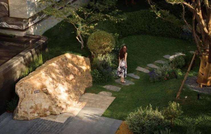 大门处有三块来自西柏坡的置石,合计200吨。水景石材是跨越了半个地球的安哥拉黑花岗岩。水景之上,约1.8米高的景墙是葡萄牙黄花岗岩。地面是豪宅经常用的滨州青石材。