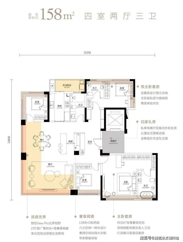 建面约158㎡户型的主卧套房实际空间约达33㎡,这个尺度能够实现当下五星级酒店套房最流行的洄游动线设计。