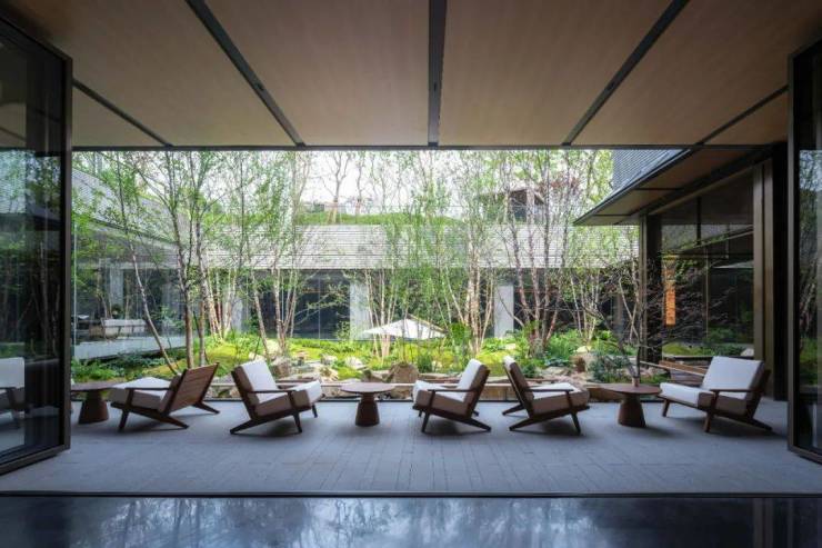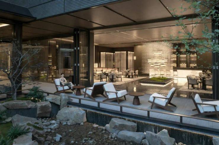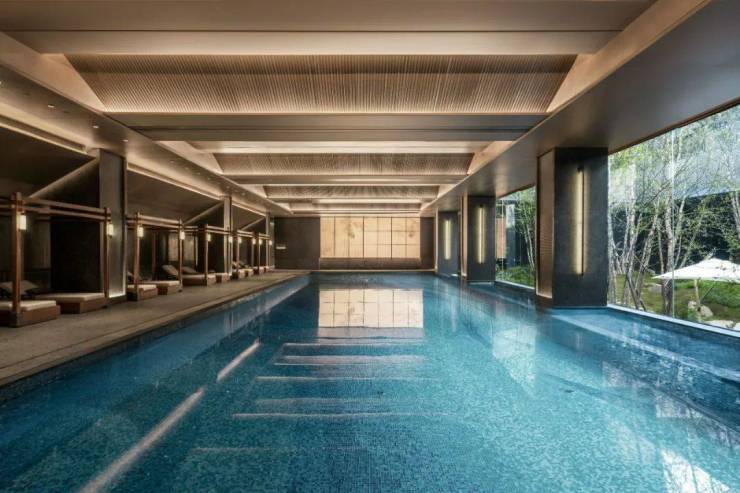 天青府围绕着下沉式庭院,做了一个面积达约2200平的会所,恒温泳池、健身房、瑜伽房、禅意茶室、SPA房……