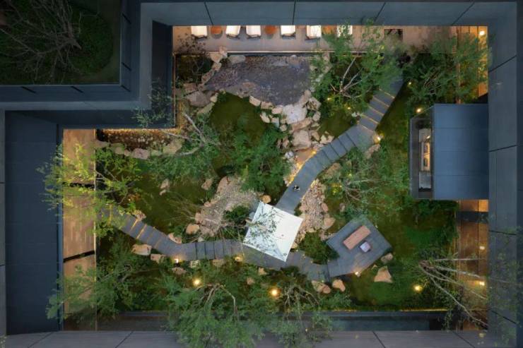 无论是大门围墙的高湖石,还是廊道景墙的(柏坡黄)花岗岩、又或是中庭景观的山西黑置石……
