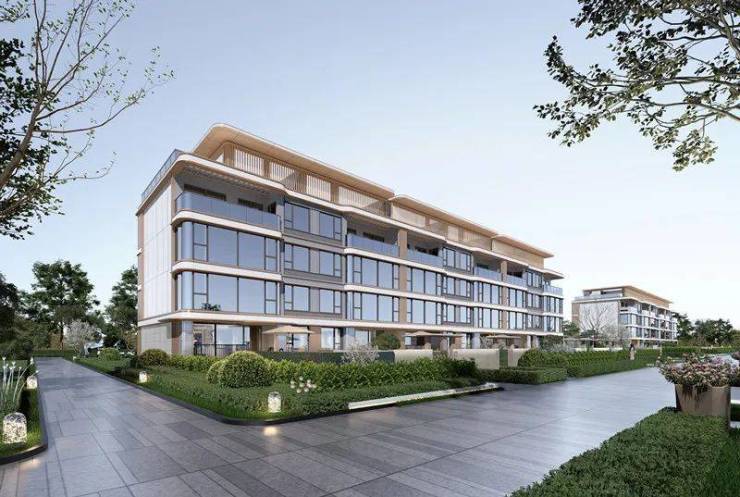 现代美学系建筑,南向外立面采用大面积落地窗,搭配湾流曲线设计和石材、铝板、多彩漆等雅淡浅色系材料,定义主城墅居封面新高度。