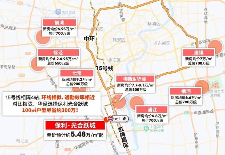 自驾的话,项目紧贴虹梅路高架,3个红绿灯即上中环!凭借虹梅路高架的优势,项目其实和华泾、梅陇、七宝处于同一价值环线。如今梅陇、华泾的新房单价都在8万左右,而保利·光合跃城,距离梅陇华泾仅4站地铁,自驾通勤效率与前者相差无几,100㎡户型几乎能节省近300万,性价比不言而喻!