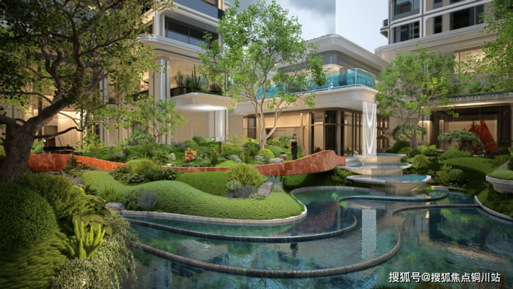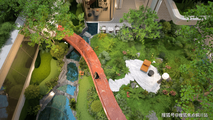 以约5米长悬挑浮岛结合立体花境打造光屿照壁,达到“风水聚煞,聚气纳财”的作用