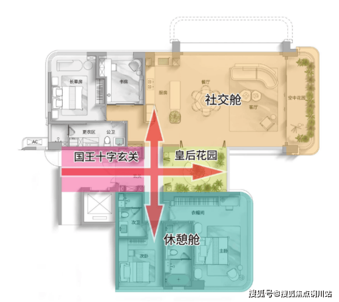 同时引入了悬浮式皇后花园,将U型端厅与U型端房串联,空间由此划分为了“社交舱”与“休憩舱”