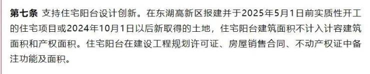 其中第七条显示,支持住宅阳台设计创新。在东湖高新区报建并于2025年5月1日前实质性开工的住宅项目或2024年10月1日以后新取得的土地,住宅阳台建筑面积不计入计容建筑面积和产权面积。住宅阳台在建设工程规划许可证、房屋销售合同、不动产权证中备注功能及面积。