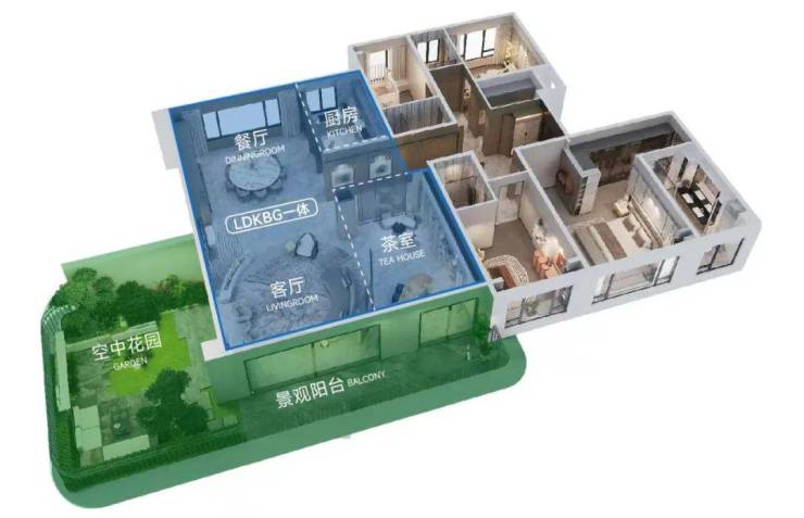 公区带来生活进化的场景革命:LDKBG一体化设计,整个空间格局彻底打开,构建无界家庭生活聚场空间,室内室外交融互动,营造更丰富的场景体验,演绎全新的家庭生活方式。