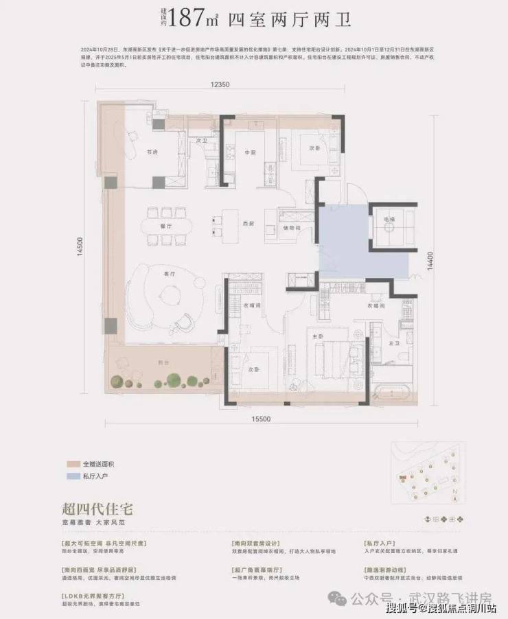 该项目首推楼栋中,1号楼为17层、2号楼为20层、3号楼为25层,均为一个单元,2梯2户设计,包含建面约150-187㎡房源,均为四房。