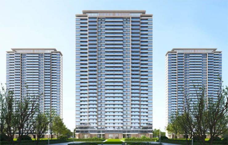 立面采用香槟色曲面铝板以及铝板线条配合多彩漆,打造酒店式风格的轻奢类公建化外立面,营造整体品质感;整体外观采用纵向维度的三段式设计,风格典雅。