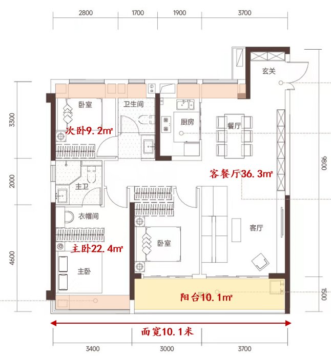 特点1:约9.8-10.1米的南向面宽,室内通风采光效果佳