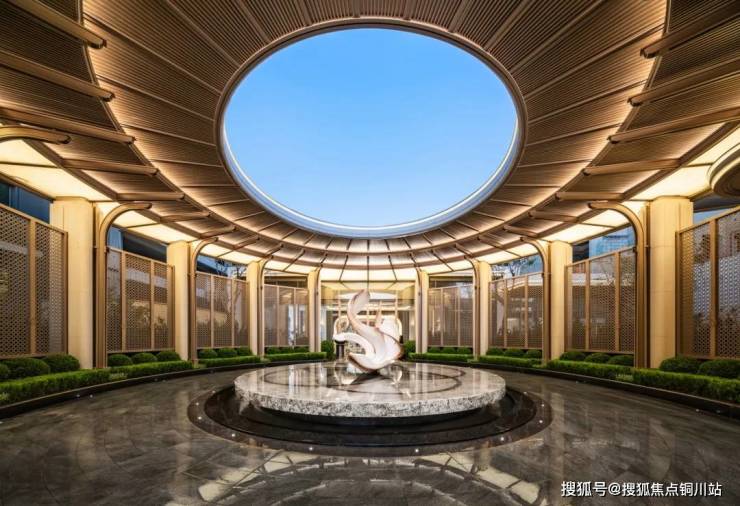 大门之后,是“棠庭邀月”主题艺术圆厅,也是归家礼序的二进空间,中间矗立一座海棠花瓣水景雕塑呼应项目“海棠系”产品。