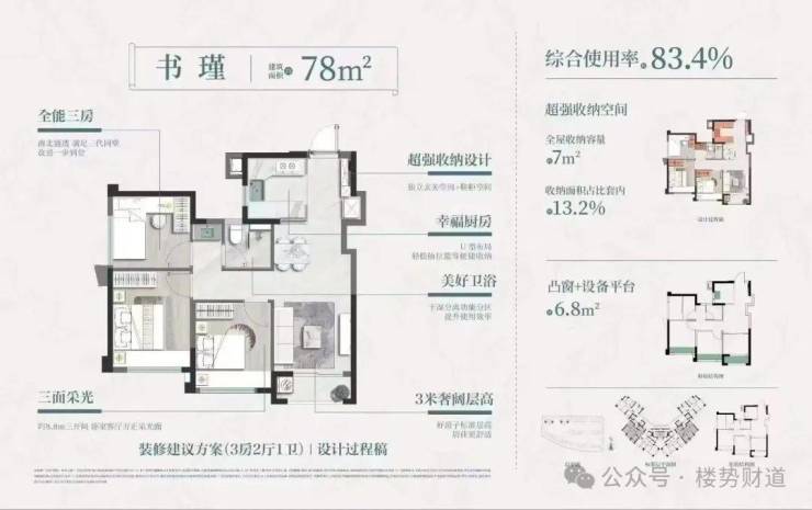 ✔️ 79㎡三房三面采光,主卧兼容1.8米床+整面衣柜[1]