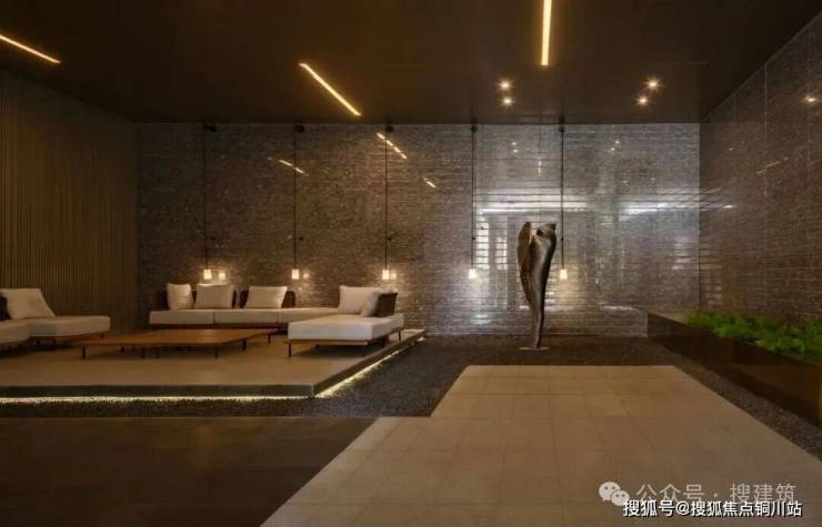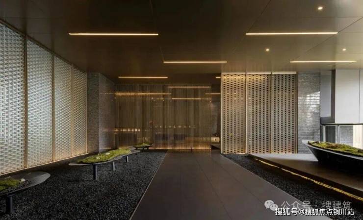 从入口空间开始,汉阳的基因便有迹可循。由主入口入内,铺装取自水纹肌理,格栅纹理由浪纹演变而来,破穹而出的摇曳树影,伴随着星光点点,渲染出一幅宁静祥和的画面。