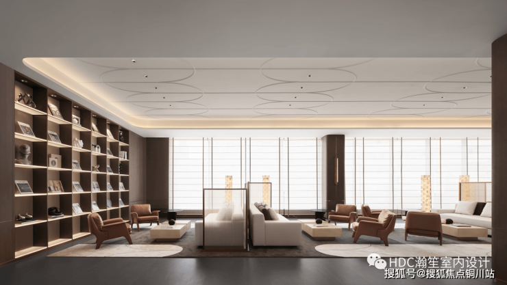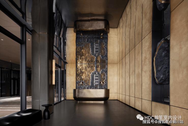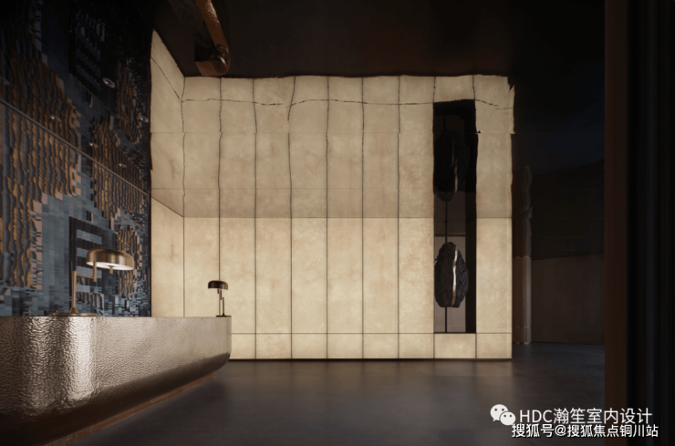 进入接待区,鼓楼印象跃然于重要的背景墙面,以充满光泽的金属材质去演绎鼓楼及旧城的朦胧轮廓,如波光粼粼的蓝金色,使得这幅有着“老城”主题的艺术品,展示出当代的“新颜”