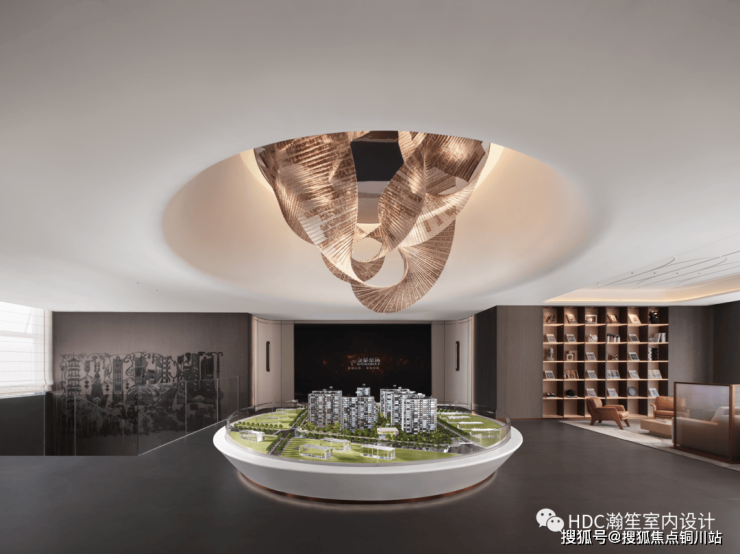 在艺术品渲染的氛围中,家具,灯具,地毯则以一种“克制”的性格存在着,成为艺术品的配角,简洁的线条,舒缓的色调,温润的质感只为向人们传达一种产品本身的初心,那就是舒适与松弛,跳跃的橄榄绿则为空间色调增加一抹层次;安静的氛围跃然于心,衬托得沙盘的顶部的艺术品,这似乎像水又似乎像丝带的艺术品在空间中尤为突出,该艺术品由何多苓老师的弟子袁晓天艺术家所创作,采用丝网材质,上面的字母均由袁老师用火焰灼烧而成,如抽离艺术般效果的字母组合起来,就是对徐州对古黄河的历史的颂扬,恰似一首吟诵的诗文“君不见,黄河之水天上来,奔流到海不复回”,豪迈而灵动,流光而溢彩!