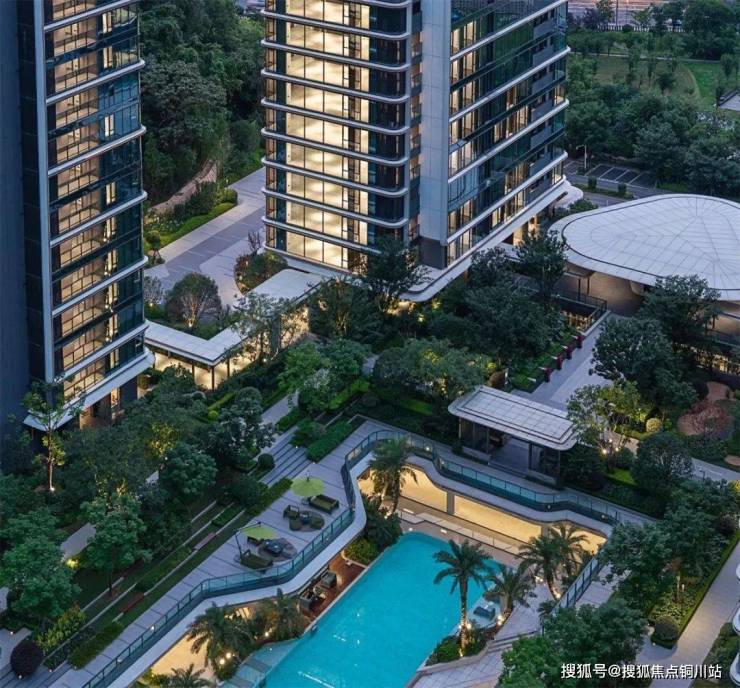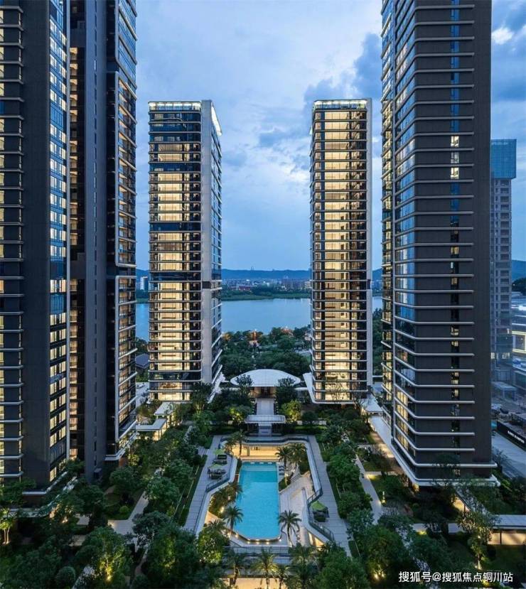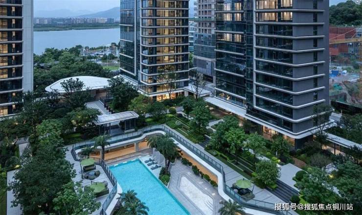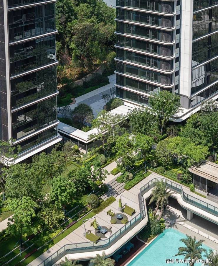 两者互相作用,使享有江景的户数比例由常规的头排共约45%提升至整个项目的90%套数,从而打破头排建筑对于景观的资源垄断,实现江景平权,让“山水入室”成为社区标配,最大化提升整体居住价值。大尺度的中央花园不仅成为社区共享的绿色氧吧与活力核心,更通过空间渗透将“山水意象”引入社区深处,贯通了内外部环境。同时,建筑整体主动退让周边山体,减少土方,保持自然水土,并使得原有山体公园的绿意得以自然延伸并无缝融入园区内部,实现蓝绿生态的交融。