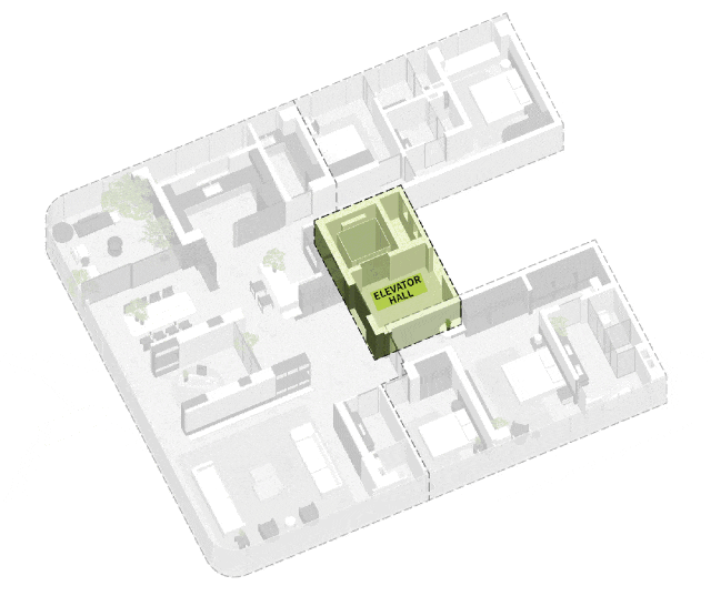 我们以地形的竖向高差为资源,延展归家体验,将主入口设在南侧较低的标高,通过阶梯、坡道与景观序列模糊标高差异并刻意拉长归家动线,使归家过程由“直达”的情景突变转为“逐次展开”的情绪铺排。我们以“无界车站”为核心,强化自驾车归家的体验。车辆并非直达地下,而是途径尽端市政林荫道路,平进社区地面层,一层布置落客/待客区,赋予如度假酒店般的抵达礼遇;地下车库“去地下化”设计,引入景观中庭,使其成为整体社区景观的有机延伸,消解传统车库的封闭压抑感。