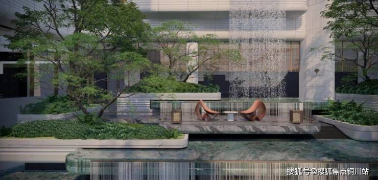 悬挑树池构建立体绿化,艺术楼梯在叠瀑轰鸣中曲折向上,悬浮在半空的休憩平台如同嵌在悬崖上的观景舱。