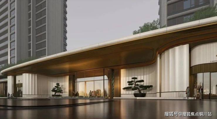 宽大的仿铜鎏金铝板挑檐下,贝金米黄石材搭配亚马逊绿奢石的景墙,做出层层递进的弧形叠级。