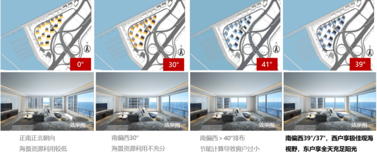 项目规划为改善型海景豪宅,面积区间在145至390平方米。全部采用电梯独立入户的设计,确保了居住的私密性和尊贵感。为保证最大景观角度,对建筑排布及户型朝向进行了多次论证,最终采用西偏南39°的建筑布局,满足西户独享极佳海景视野,东户保证全天充足阳光。