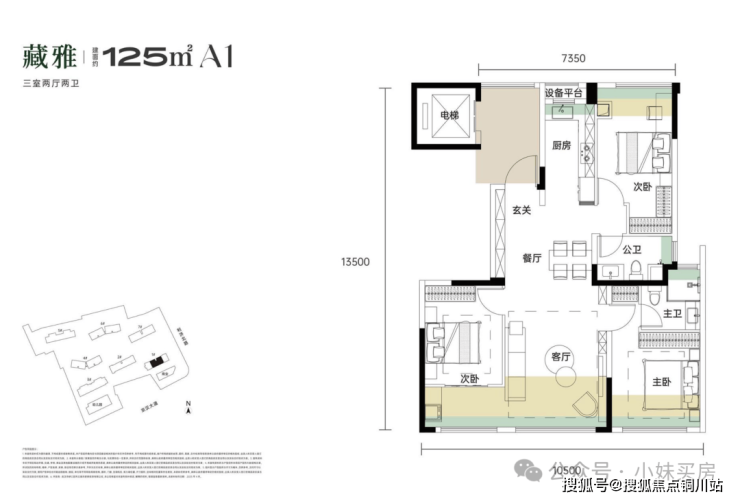 主推面积段115-170平米,最大得房率宣传超100%,但目前已对外释放的户型图包含2个,分别是115平的三房,以及125平的三房,都位于1号楼,也就是预计首推的楼栋,得房率大约在95-98%左右,后续会推出约143、170平米户型,但目前户型图尚未出炉。