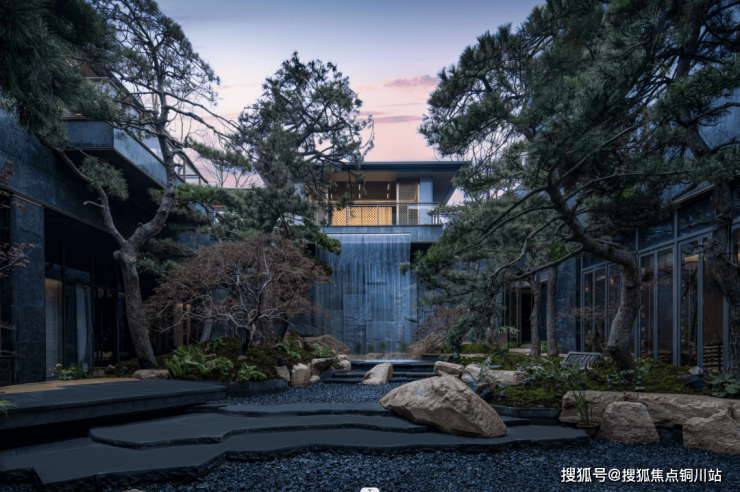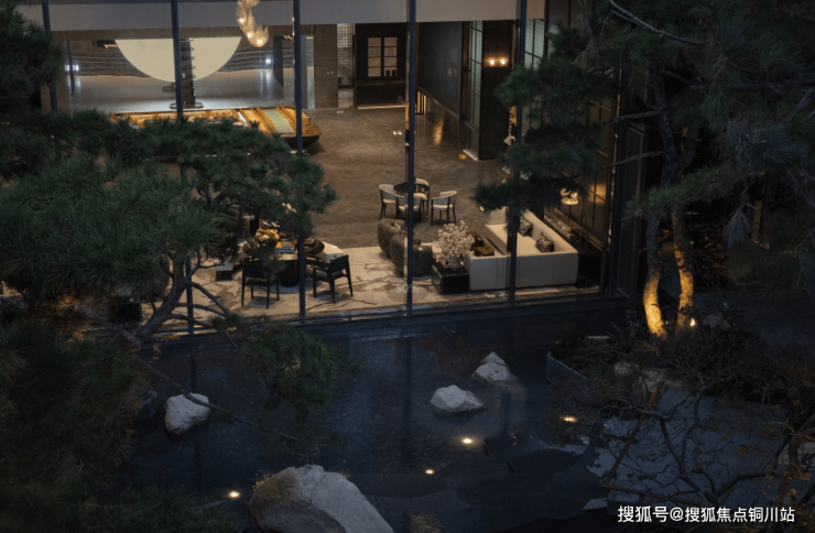 秉持“只定制不复制”的造园理念,项目更是大手笔的全冠移植了9棵百年油松,或飘逸如云、或苍劲如龙,与龙鳞纹铺装、宋风回廊共同勾勒出“松风水月”的隐逸气质。
