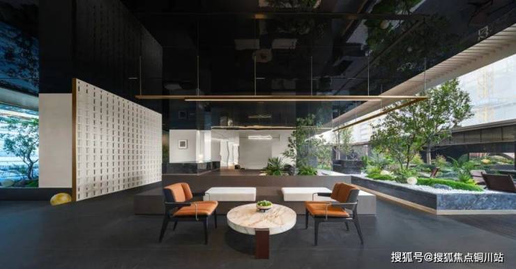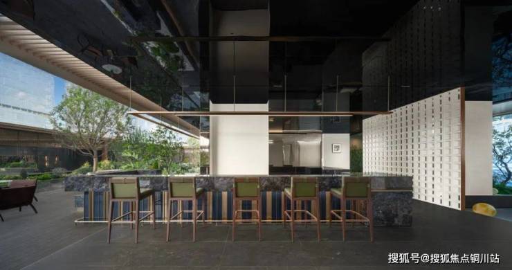 中央为会所式水吧设计,打造高星酒店式中央会客区。南北架空形成自然通风的开放式会客场域,北侧休闲空间延伸至户外,坐赏三进院绿意葱茏、花木摇曳,颇有户外度假风情。