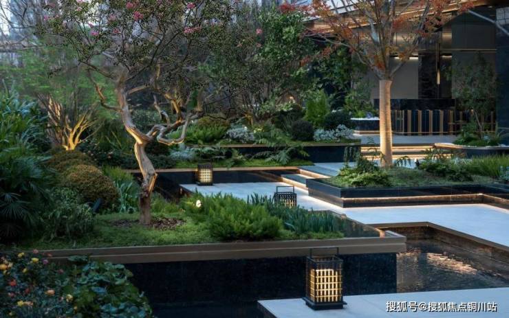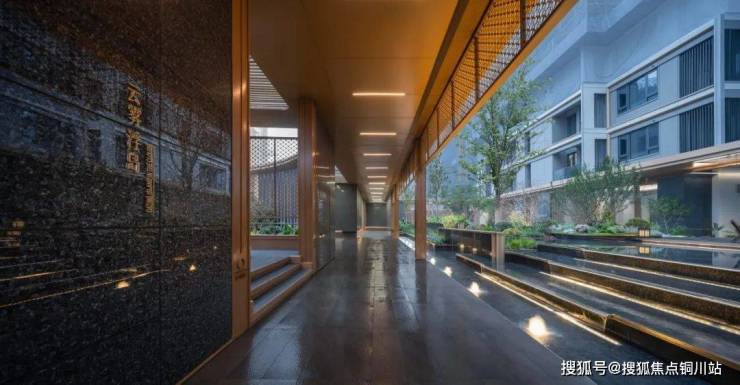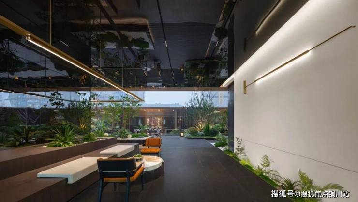 主庭院满庭芳月,融合植被、水景、照壁、雕塑等元素,将空间的静谧艺术融入到场地之中。曲折洄游,浓荫悠然繁花相送,便成【水月花堤】之景。廊架之下或室内外交融过渡空间,【月栖闲庭】的闲适感扑面而来。
